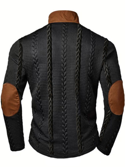• Design: Half-zip stand collar; contrast faux leather yoke & elbow patches; vertical braided texture; ribbed cuffs & hem